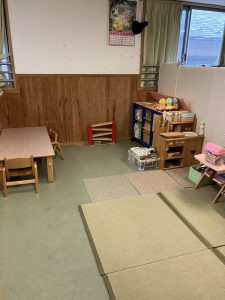 3月末から4月始めにかけて、一時保育には幼稚園の春休み中に預けたい方や、上のお子さんの卒園・入学式中に預けたい方などの利用が見られます。通常は0~2歳の子が多いのですが、この時期は3歳以上の子が増えます。一時保育室には割と小さい子向けの玩具が多いため、大きい子が来ると、隣の幼児クラスの方とどちらで遊びたいか聞いて、その子の要望に合わせています(小さい子でも遊べます)。大きい子は大体幼児クラスの方を選んでいますが、途中から「こっちで遊ぶ」と一時保育室に入り、遊ぶ姿も見られます。天気の良い時は本人が嫌がらない限りは園庭で他の園児と共に遊んでいます。