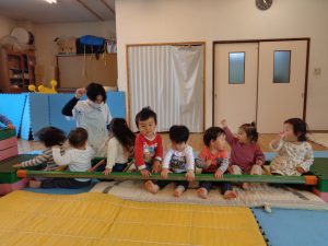 一週目の後半のある日。ブロックで遊びたい子がいました。最初はいつも一緒にいた保育士の手を掴み、「ブロックであそぼう」と誘われ、一緒に遊びます。しばらく遊んでいると、別のお友達に助けを求められました。「ブロックで集中して遊んでいるな…。」と思い、その場をそっと離れることにしました。しかし、ダーッと私の元へ走ってきて「ブロック作ろうよ!」とやって来ました。その子には「今、他のお友達が困ってるんだ、ちょっと待っててくれる?」と話しますが、「うん…一緒に作ろうよ~!!」と少し泣きそうです。私もどうしようかと困っている時に、他の保育士が「近くにいるお兄さんすごいの作れるよ!一緒に頼んでみようよ!」と声を掛けてくれました。保育士がお兄さん達に事情を説明すると、「そうなんだ!何作りたい?何色がいい?」「一緒に遊ぼう!」と優しく声を掛けてくれました。遠くから一緒に遊んでいる様子を見て安心しました。まだまだ分からないことだらけの子ども達ですが、上のクラスの子がこんなにも優しく丁寧に教えてくれるのを見ると、改めて異年齢の関わりはとても大切だなと感じる事が出来ました。きっと子ども達も優しくしてくれたことを覚えていると思います。