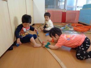 最近、電車の線路が電車ゾーンから大幅に飛び出し、ながーい線路を目にすることが多くなりました。ある日のこと、手作り電車をつなげること(磁石が入っていて連結できる)が好きなKくんが、電車をつなげ、線路の上を動かし始めました。すると、線路をつなげることが得意なYくんが、Kくん電車の線路が途切れてしまわないように、Kくんの前方に次々と線路を足していきます。その連携プレイが見事で感心してしまいました。