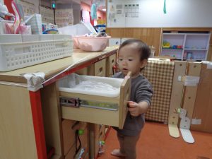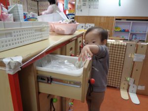 保育園では、子どもたちは自分のマークがあり、靴下や帽子、食べ終えた後のエプロンなど同じマークの入れ物や引き出しに片付けをします。0歳児も同じように引き出しがあり、片付けますがもちろん自分では出来ません。初めの頃は保育士が片付けをしていました。しかし、徐々に理解が増えていき、身の周りのことなどを自分でやろうとする姿が見られるようになってきています。その様子を見て私たち保育士も”これを片付けるのだったらできるかな?”など、興味を持ったことから子ども達が自分で出来るように援助を行っています。しかし、やっていく中でも”今日はやりたくない!”と思うときもあるようです。大人と一緒ですね(笑)そんな時は無理やりにせず、「今日は先生がやるね」と伝えてお休みする時も。