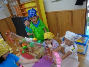 8月には年長行事のワクワクDAYがありました。まずは話し合い。どんなことをしたいか年長児と一緒に決めていきました。子どもたちからは、お店屋さんをやってみたいとのこと。アイス屋さんや、おもちゃ屋さん、ドレス屋さん、中華屋さんなどのお店をやることに。どんなお店にする?そのお店には何があって、何を作る?と話し合う中で、それぞれのイメージを伝え合い、画用紙や段ボール、カラーポリ袋といったたくさんの素材を使って、商品を作りました。