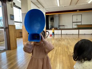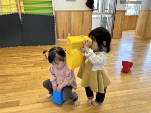 好きな遊びを見つけられるとどの子も夢中になって楽しむ様子もあります。お姉さん達が使っている遊びに興味を持ち同じようにやってみようと真似をする姿や、手伝ってもらうと笑顔でお姉さんを見上げて嬉しそうにしていました。又、遊び慣れた玩具を見つけるといつも作る車を組み立てて遊び慣れているお友だちとじゃれ合いながら笑顔を浮かべる姿もあります。