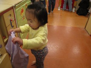 2歳児クラスのつぼみ組の子どもたちは3月から2歳児だけの小さな集団から3・4・5歳児クラスの大きい集団へ移行の期間が始まりました。移行が始まるとお兄さん・お姉さんのお部屋への憧れが強い子は張り切って自ら上履きを履いたり、かっこよく並んでいる子や「ここでは遊びたくない!帰りたい!」と2歳児クラスのお部屋に帰りたいという意思表示をする子もいました。