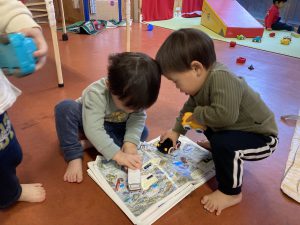 そんなやりとりに気づいた別の子が車を取りに行って一緒に図鑑の上で車を走らせてあそび始めたのです。