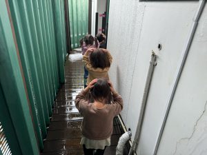 そんなお友だち大好きな子どもたちと、つぼみぐみ(2歳児)のお部屋であそんだ帰り道のこと、その日は雨が降っていました。天気の悪い時や遊戯室へ行く時にしか使わない通路があるのですが、そこは屋根がついているので雨には濡れません。その通路を通って移動していると、かなり強い雨だったこともあり、子どもたちも飛んでくる水滴に少し困った表情で歩いていました。すると、Aくんが先頭で「こうすればいいんだ」と自分の両手を頭に乗せました!その姿を見るなり「そっか!傘だね!」とみんなで頭を守りながら進んでいきます(笑)後ろから見ている私としては、あまり水滴が避けられているようには見えませんでしたが…。子どもたちなりに、どうしたら雨を避けられるかを考え、そしてそれをお友だちにも共有しようとしたんだなと思います。みんなで同じことをしていることに「おもしろいね」とケラケラ笑い声も聞こえてきて、ただの帰り道でしたがとても楽しい時間となっていました。そんな子どもたちの姿を後ろから見守り、とても可愛いらしく癒し効果抜群だな、としみじみ思った。